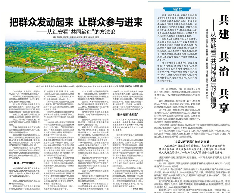 聚焦全省开展美好环境与幸福生活共同缔造活动试点,湖北日报开设专栏、专版、专题以,以通讯、评论员文章、新媒体产品等形式,全方位、多角度总结“共同缔造”的成功经验、探索实践,挖掘宣传“办实事、暖民心”的典型事迹,反映群众身边的点滴变化,凝聚共同奋斗的精神力量。