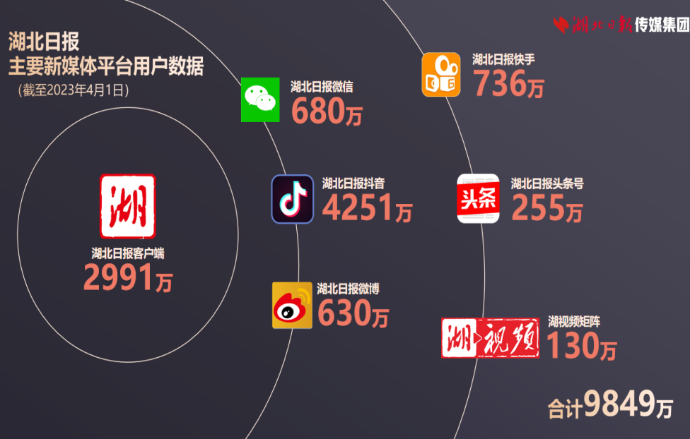 全媒体传播矩阵影响力持续增强。集中力量做强做大湖北日报、极目新闻两大自有端网平台,以此为“主轮”,巩固发展第三方平台大号、探索发展垂直分众传播两个“副轮”,构建媒体融合“三轮驱动”新格局取得新进展。截至2022年12月,湖北日报全媒体用户9360多万,湖北日报客户端频道总数达123个,微博、微信、抖音号影响力稳居全国省级党报前列;极目新闻全媒体用户量突破1亿,荆楚网微信传播力稳居省级重点新闻网站首位。支持10个账号探索发展垂直分众传播,涉及体育健身、党建服务、小学教育、中医药、职业教育等细分领域。