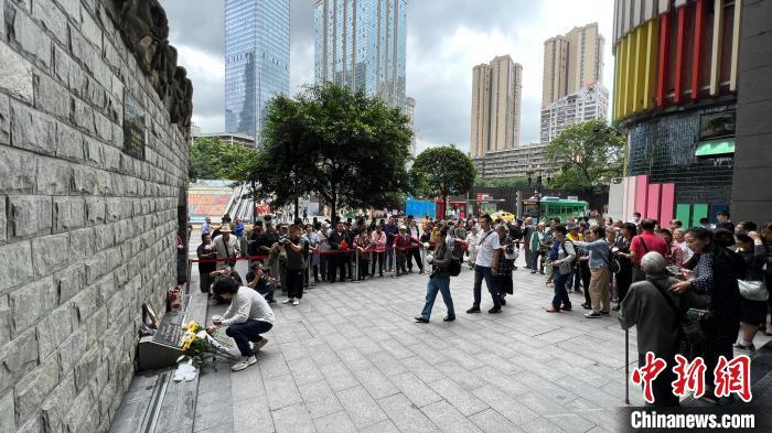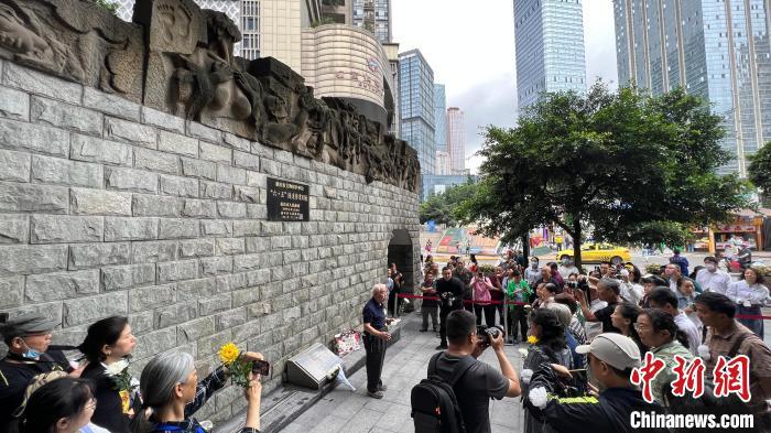 图为重庆大轰炸幸存者及遇难者亲属来到重庆大轰炸惨案遗址前,悼念遇难的亲人和同胞。 肖江川 摄