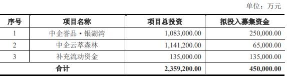 本次发行股票募集资金总额预计不超过450,000.00万元(含本数),扣除发行费用后拟用于中企誉品·银湖湾、中企云萃森林、补充流动资金。