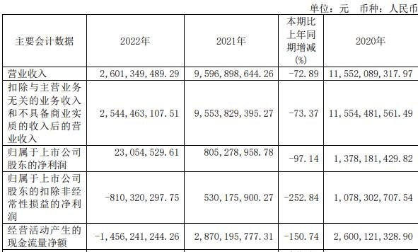 据中华企业2022年年报,报告期内,公司实现营业收入26.01亿元,同比减少72.89%;归属于上市公司股东的净利润2305.45万元,同比减少97.14%;归属于上市公司股东的扣除非经常性损益的净利润-8.10亿元,同比减少252.84%;经营活动产生的现金流量净额-14.56亿元,同比减少150.74%。