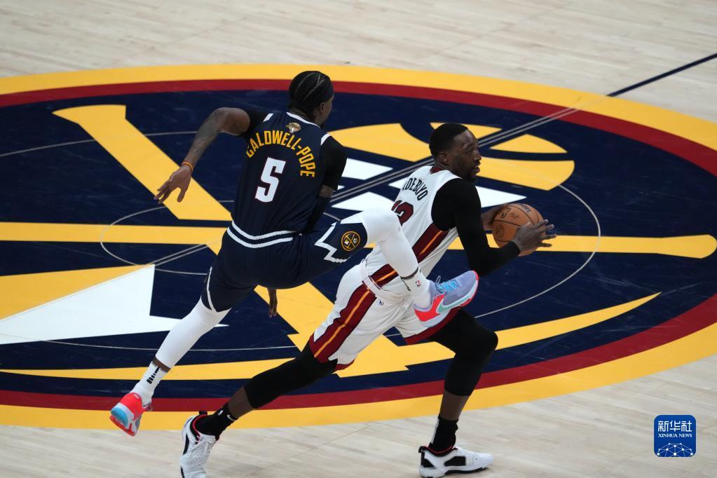 6月4日,迈阿密热火队球员巴姆·阿德巴约(右)突破丹佛掘金队球员肯塔维奥斯·考德威尔-波普防守。新华社记者 吴晓凌 摄