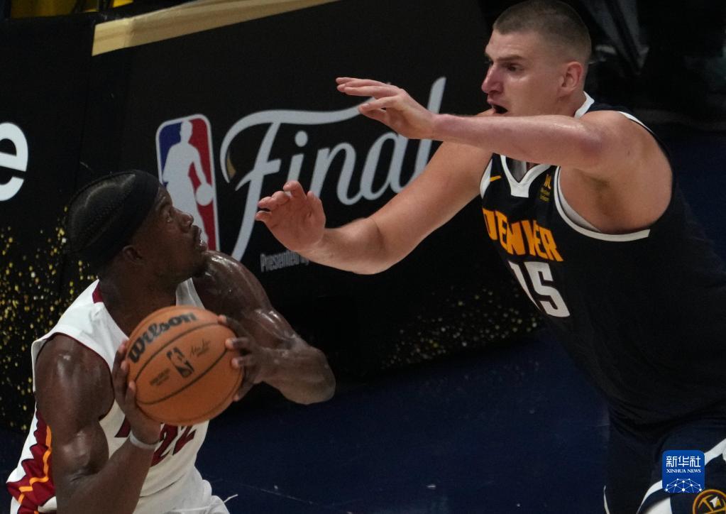6月4日,丹佛掘金队球员尼古拉·约基奇(右)在比赛中防守迈阿密热火队球员吉米·巴特勒。新华社记者 吴晓凌 摄