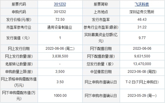 飞沃科技2023年6月5日发布的首次公开发行股票并在创业板上市发行公告显示,若本次发行成功,预计公司募集资金总额为97,657.50万元,扣除发行费用约12,506.89万元(不含增值税)后,预计募集资金净额约为85,150.61万元。发行费用及募集资金的使用计划已于2023年5月26日(T-7日)在《招股意向书》中予以披露。