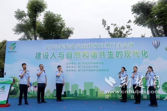 荆楚网(湖北日报网)讯(通讯员 孙治斌)6月5日上午,荆门市生态环境委员会组织各成员单位、企业代表、市民代表等社会各界齐聚龙泉公园,共同参与2023年纪念六五环境日荆门主会场活动,市环保志愿者协会、市志愿者协会、荆门职院学生代表冒雨参加本次活动。