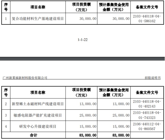 新莱福实际募资净额比原拟募资多11,517.64万元。新莱福2023年5月31日披露的招股书显示,公司原拟募资83,000.00万元,用于“复合功能材料生产基地建设项目”、“新型稀土永磁材料产线建设项目”、“敏感电阻器产能扩充建设项目”、“研发中心升级建设项目”。