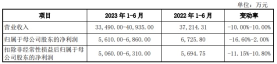 结合市场环境和公司目前经营状况,经初步测算,公司预计2023年1-6月营业收入33,490.00万元-40,935.00万元,变动率为-10.00%-10.00%;归属于母公司股东的净利润5,610.00万元-6,860.00万元,变动率为-16.60%-2.00%;扣除非经常性损益后归属于母公司股东的净利润5,060.00万元-6,310.00万元,变动率为-11.15%-10.80%。