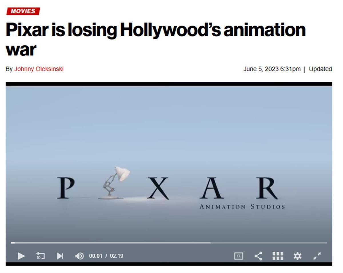 “皮克斯正在输掉好莱坞的‘动画大战’”,6月5日,《纽约邮报》以此为题发文,指出皮克斯最新的电影缺乏“上世纪90年代电影的那种火花”。