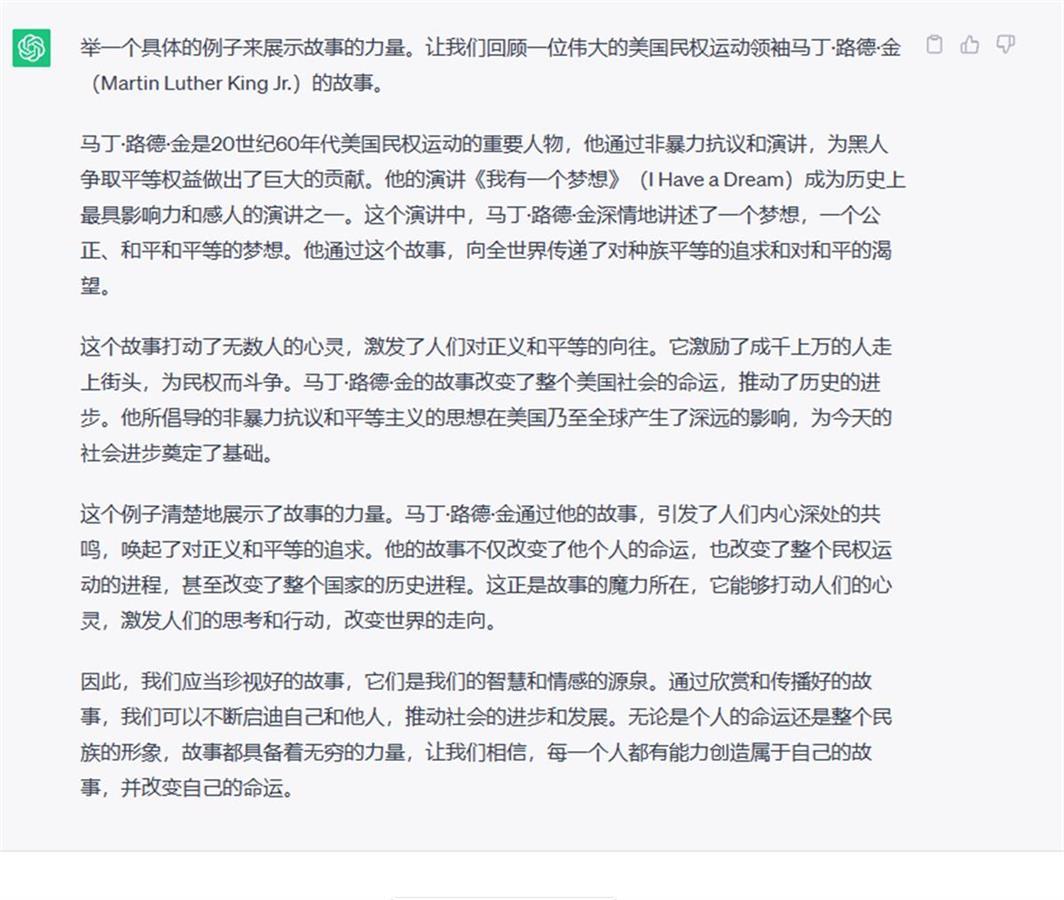 这个例子清楚地展示了故事的力量。马丁·路德·金通过他的故事,引发了人们内心深处的共鸣,唤起了对正义和平等的追求。他的故事不仅改变了他个人的命运,也改变了整个民权运动的进程,甚至改变了整个国家的历史进程。这正是故事的魔力所在,它能够打动人们的心灵,激发人们的思考和行动,改变世界的走向。