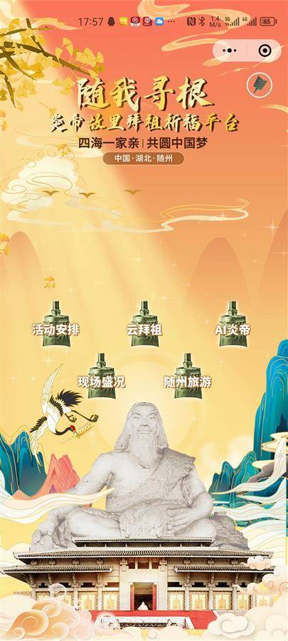 该小程序分5个板块,包含活动安排、云拜祖、AI炎帝、现场盛况和随州旅游。指尖轻轻一点,届时用户便能观看癸卯年寻根节直播,查看历届大典回顾、癸卯年寻根节活动指南和随州市旅游景点攻略。同时,小程序还开通了网上“云”拜祖渠道,方便不能来到祭拜现场的海内外华人华侨和广大炎黄子孙在线上表达拜祭之情。