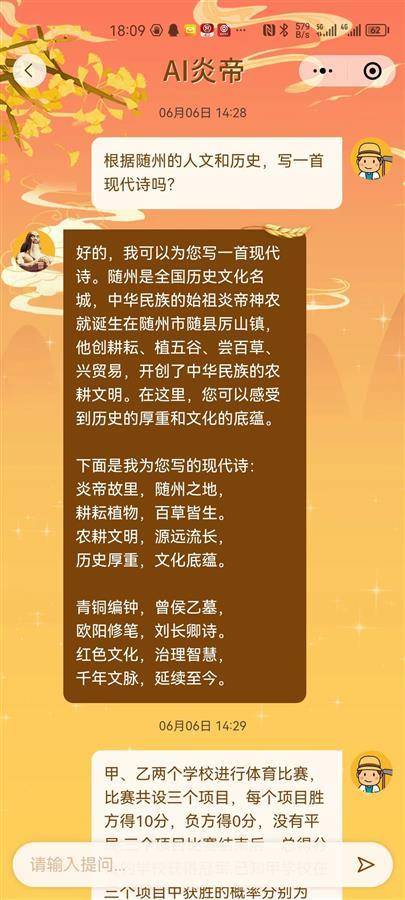 “可以帮我设计随州一日游旅行线路吗?”“能不能绘制一幅随州美食拐子饭的图画?”发布现场,观众和“AI炎帝”频频互动。面对一道往年高考数学真题,“AI炎帝”几秒钟便给出了正确答案。据介绍,该功能由筹备组联合百度文心大模型、深圳尚道科技数据训练团队开发,打造了炎帝千问、炎帝绘图等互动功能,旨在通过实用工具结合新科技体验,将小程序阶段性的功能转变为日常性功能,让炎帝文化以全新的形态融入日常生活,彰显随州“信义由礼、乐合来仪”的城市文化特质。