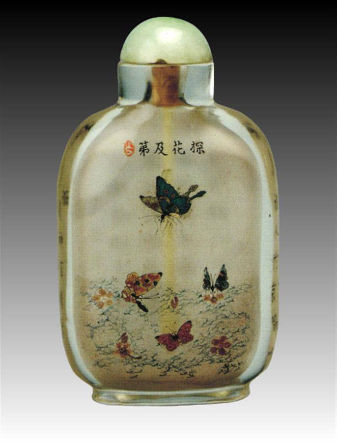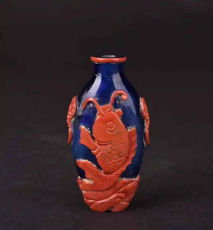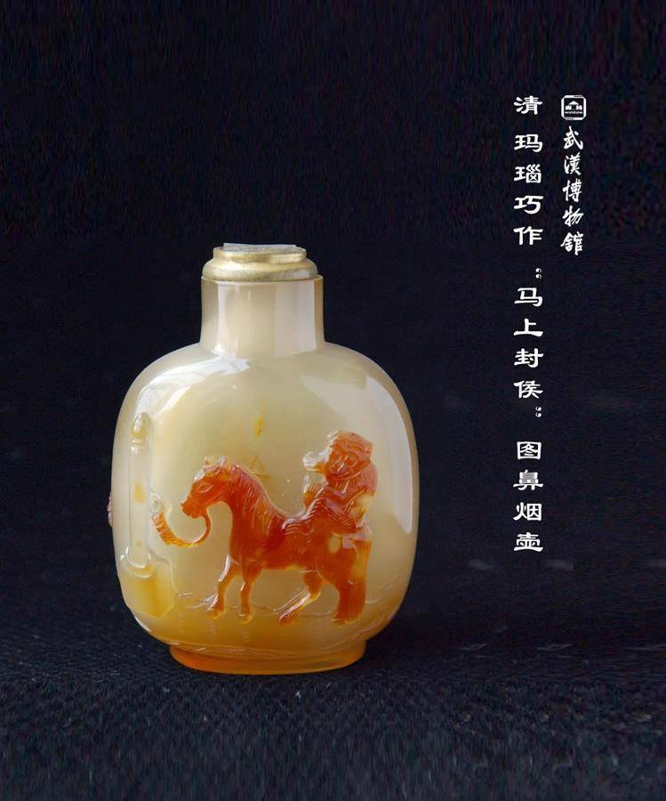 武汉博物馆藏一件清代玛瑙巧作“马上封侯”图鼻烟壶,造型端庄,壶面晶莹透亮,动物形象逼真,利用玛瑙的纹理,依形雕刻一匹奔驰的骏马,显得动感十足。一只猴子骑坐在马背之上,有“马上封侯”的寓意,整个图案妙趣生动,富于神韵,极富感染力。该馆还收藏一件清代套料红利图鼻烟壶,鲤跃龙门,栩栩如生,寄托着寄托着古人改变命运的渴望。
