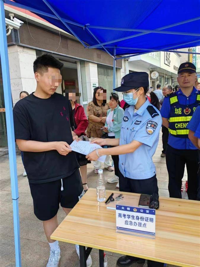 6月7日上午8时20分,大悟县一中教师和高考学生在考点值守民警带领下来到高考考生身份证明办理点,称考生身份证不慎遗失,户政室工作人员一边迅速登记考生信息,第一时间推送到县局,一边做好考生安抚工作,10分钟后治安大队负责人将紧急身份证明送达考生手中,确保考生顺利进入考场。