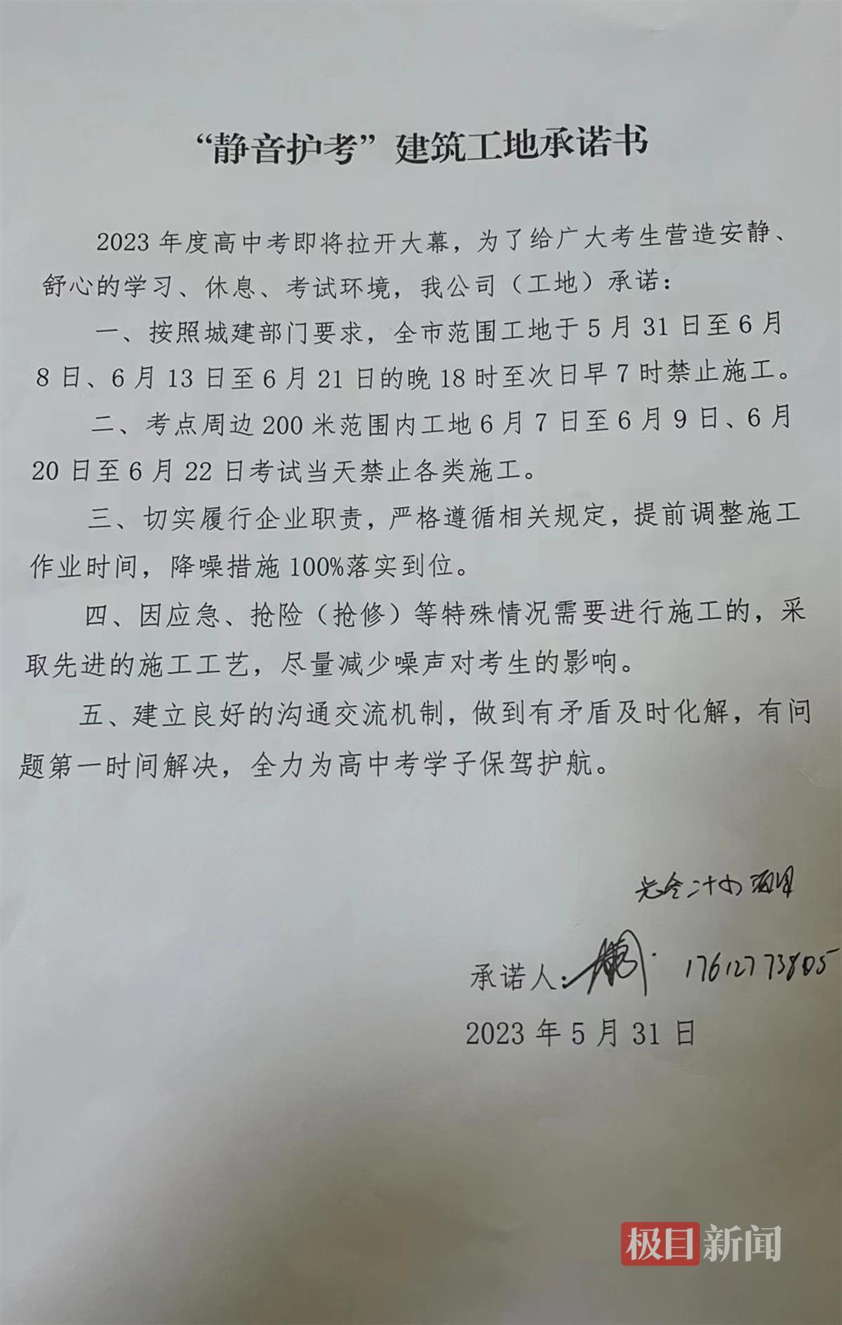 “该工地在5月31日签订了中高考静音承诺书,仅过7天,就违背了承诺,公然顶风施工。”执法队员告诉极目新闻记者,当即立即责令停止施工,并进行现场守控,后续将依法进行严肃处理。