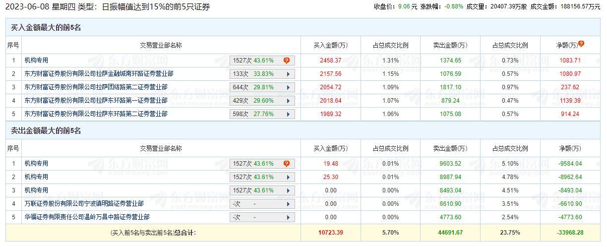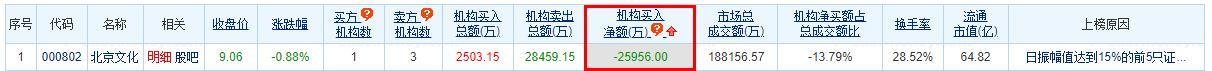 龙虎榜数据显示,北京文化买入金额最大的前五名中,有1家机构专用席位;卖出金额最大的前五名中,有3家机构专用席位。经统计,北京文化的机构席位今日净卖出金额为25956.00万元。