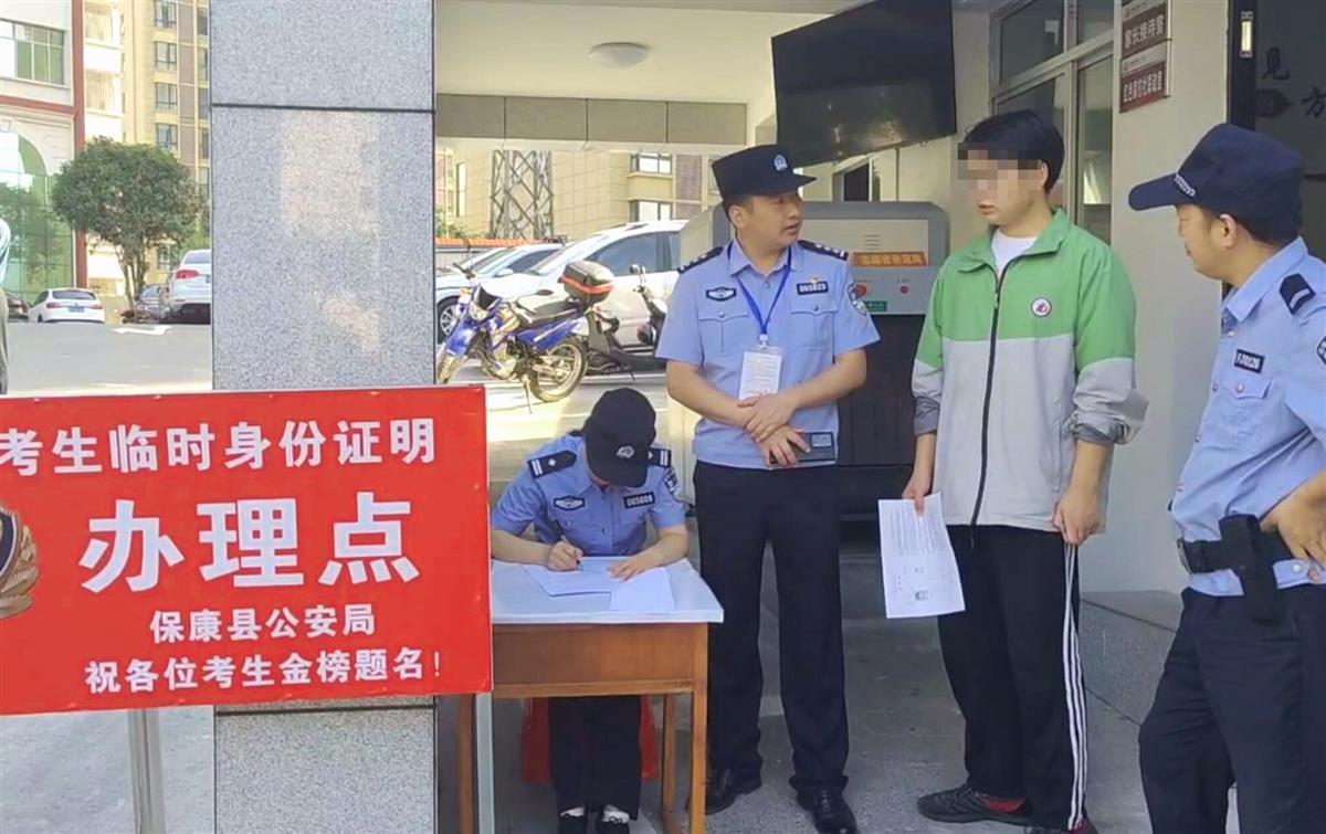 6月9日高考第三天,湖北省保康县一中考点。上午8时11分,考生黄同学临考前发现身份证遗失。考场外临时身份证办理点民警得知情况后,立即通过警务通核查考生信息,仅用时2分钟就为考生出具临时身份证明。临走,民警还不忘安慰考生:“好好考试,莫紧张!”