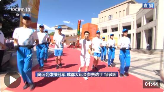 北京大学百周年纪念讲堂前的广场上,9点30分,火种盆和成都大运会火炬“蓉火”相继点燃后,第一棒火炬手、成都体育学院学生、体操奥运冠军邹敬园接过火炬,在成都大运会火炬传递主题曲《我们都是追梦人》的背景音乐下,高举火炬昂首跑出会场,开始了成都大运会火炬传递。在31棒火炬手的依次传递下,成都大运会火炬“蓉火”经过博雅塔、未名湖、李大钊像、革命烈士纪念碑等北京大学校园内的标志性点位。首站传递的火炬手还包括2001年北京大运会首棒火炬手杨凌、2009年哈尔滨大冬会首棒火炬手于静、2011年深圳大运会首棒火炬手邢衍安。四届大运会首棒火炬手齐聚北大、同框传递,这不仅是大运火种的传递,也是大运精神的传承,更是我国大学生体育事业、青少年体育事业蓬勃发展、薪火传承的生动诠释。