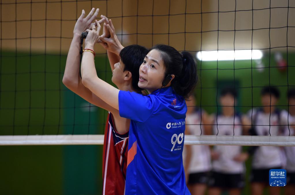 6月10日,魏秋月(右)指导香港青年球员拦网技术。新华社记者 卢炳辉 摄