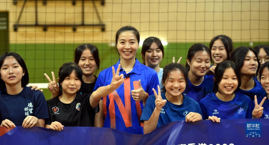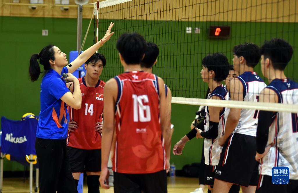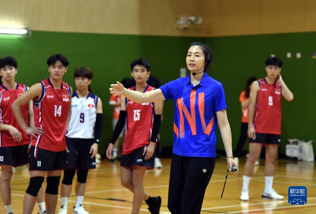 6月10日,魏秋月(左一)指导香港青年球员拦网技术。新华社记者 卢炳辉 摄