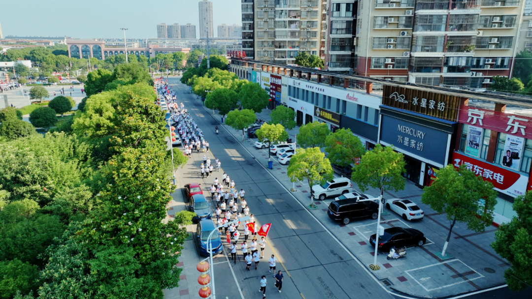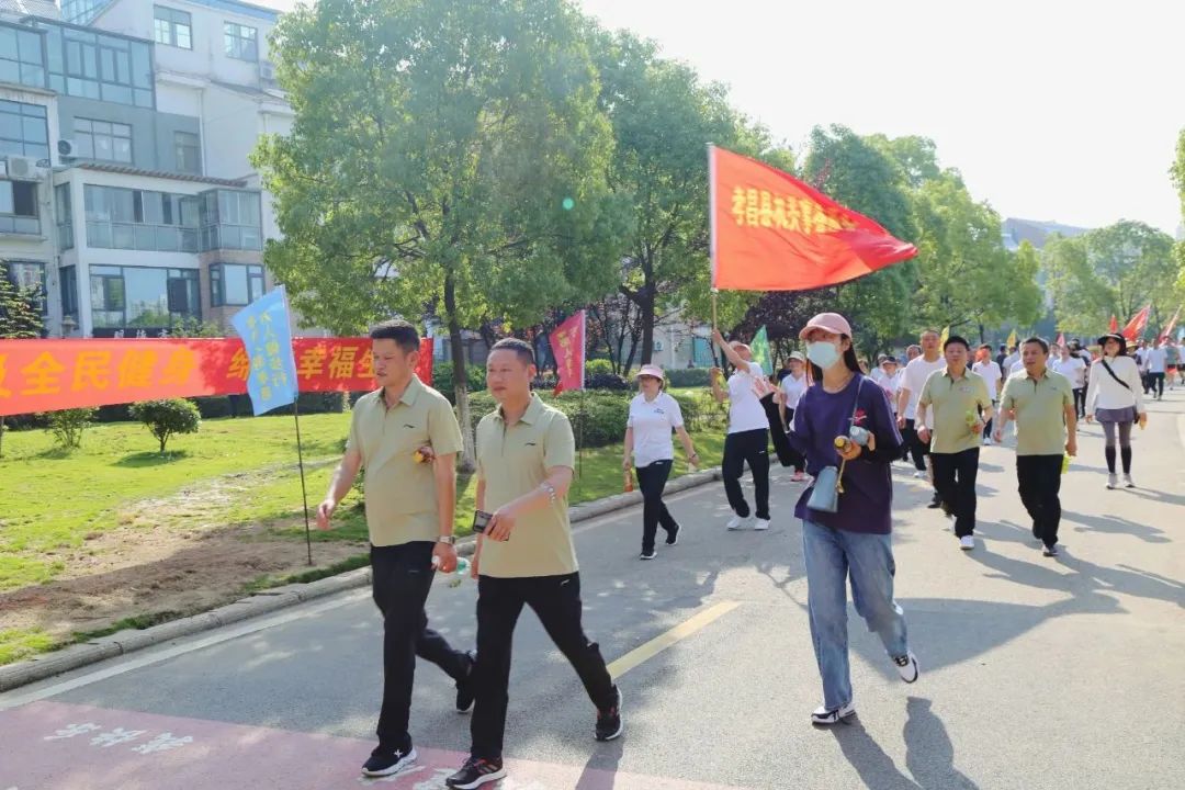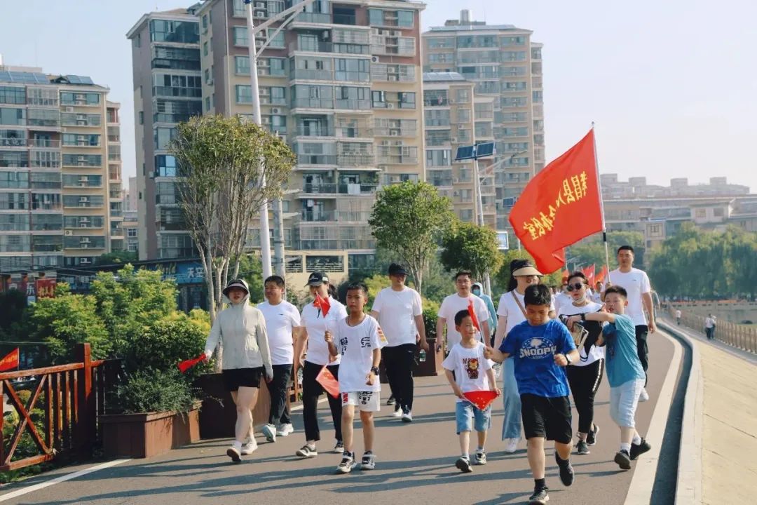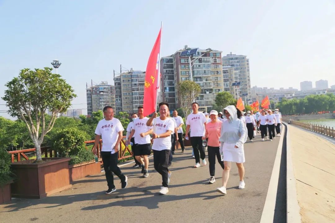 上午8点,1500余人队伍的“健走模式”开启,各方阵高举红旗从花园广场出发,途径桃源路,再绕官塘湖环湖步道一周,全程约5公里。