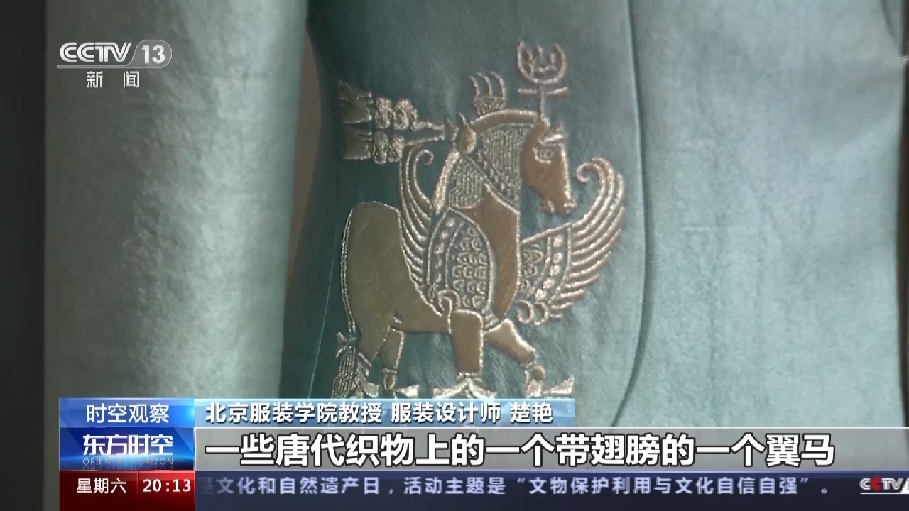 北京服装学院教授、服装设计师 楚艳 :我们发现了在新疆出土的一些唐代织物上的一个带翅膀的翼马,我们今天到中亚,比如像乌兹别克斯坦的一些壁画,包括他们的古代纹样当中可能都能看到跟这个非常相似的,所以在丝绸之路上东西方的文化,包括服饰纹样,包括制造技艺也是一直进行着交融和碰撞。我们也是觉得非常具有开放包容,东西方文明互鉴的一个理念。