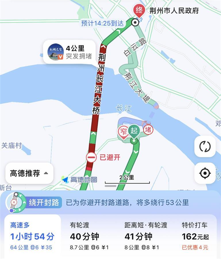 不过,实时导航程序显示,荆州和顺汽渡的江南码头也因车流量较大发生严重拥堵。车辆要想从江南到江北,导航推荐的最优路线是绕行沙公高速,再转道沪渝高速,需要多行驶约100公里才能顺利过江。