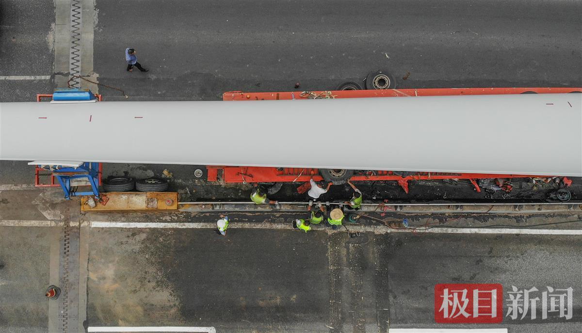 6月11日,二广高速荆州长江大桥桥北收费站附近,一辆运载风车叶片的大型运输车卡在高速公路转弯路段(极目新闻记者 黄志刚 摄)