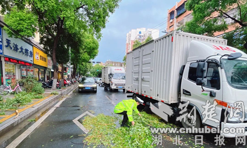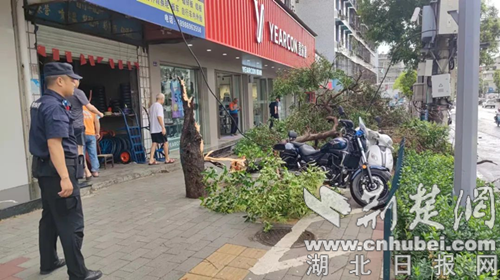 一中队执勤队员化身“清障员”,扶起路边吹倒的电动车、垃圾桶,清理多处横拦在路上的树枝。同时,针对较大的不能及时清理的倒塌树木,在设置警示锥形桶后及时对接相关职能部门进行处理,确保辖区道路通畅、安全。