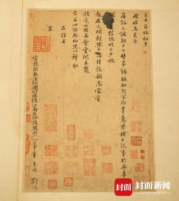 此外,辛弃疾唯一传世真迹《去国帖》也震撼登场。在大众印象中,他是一位豪放派的词人,但他同时也是一位将领。策展人说,辛弃疾在二十多岁时就奉命抗金,之后宦海沉浮也一直没有放下初心,想要报效国家,收复北地。而此帖是《宋人手简册》中一页,内容为酬应类。文中“秋初去国……日从事于兵车羽檄间”,是指在江西提刑任平“茶寇”赖文政事。“里面有讲到辛弃疾平茶寇的一些事,也表现了他从政为官的能力。”