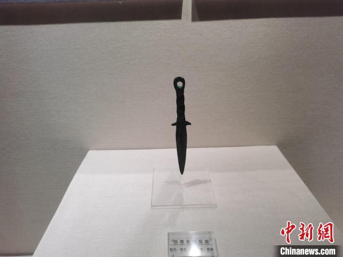 在朱开沟遗址展厅内记者看到,这把青铜短剑(复制品)长25.4厘米,剑身近似柳叶形,厚脊,双面刃,直柄,中间有两道凹槽,柄首略呈环状,柄与剑身衔接处的两侧有凸齿,剑身向下斜凸成锋,柄部缠绕麻绳。