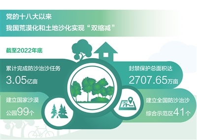党的十八大以来,我国防沙治沙工作取得举世瞩目的巨大成就,荒漠化和土地沙化实现“双缩减”,风沙危害和水土流失得到有效抑制。截至2022年底,累计完成防沙治沙任务3.05亿亩,封禁保护总面积达2707.65万亩,建立全国防沙治沙综合示范区41个、国家沙漠公园99个,在我国北方风沙线上筑起一道乔灌草科学配置的绿色生态屏障。