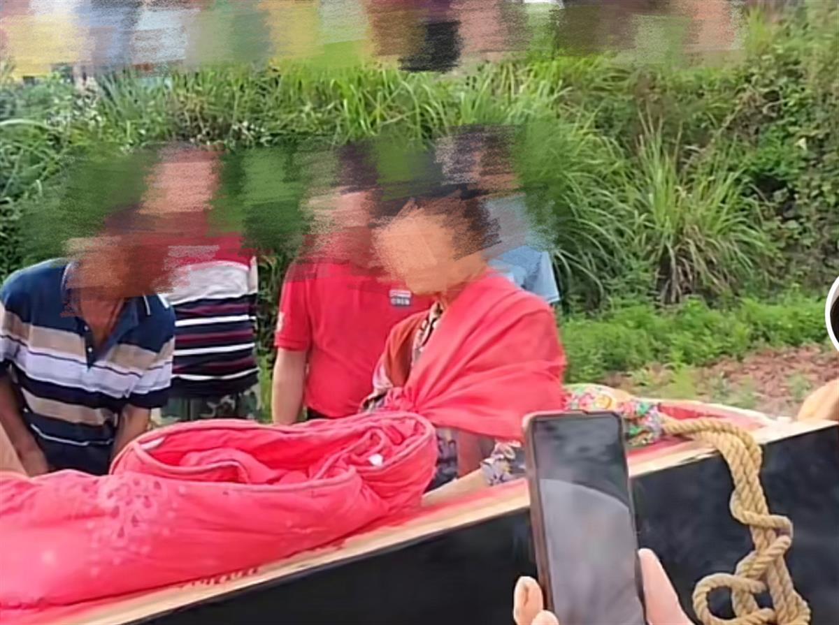 视频显示,一位穿着红色衣服的老太坐在棺材里,多名男子正抬着棺材在田地里前行,不远处还燃放起了鞭炮,附近有不少人围观。