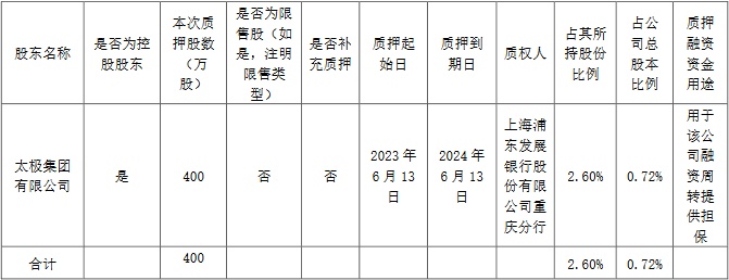 中国经济网北京6月15日讯 太极集团(600129.SH)昨日晚间披露公告称,公司于昨日接控股股东太极集团有限公司(以下简称:太极有限)通知,获悉其所持有公司部分股份办理了质押登记手续。太极有限本次质押太极集团400万股,占其所持股份比例2.60%,占太极集团总股本比例0.72%,质押起始日为2023年6月13日,质押到期日为2024年6月13日,质押融资资金用于该公司融资周转提供担保。