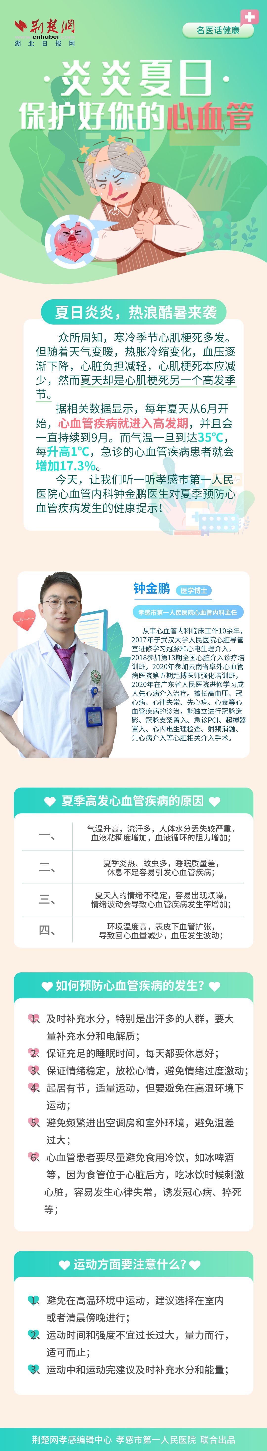 夏日炎炎,热浪酷暑来袭。众所周知,寒冷季节心肌梗死多发。但随着天气变暖,热胀冷缩变化,血压逐渐下降,心脏负担减轻,心肌梗死本应减少,然而夏天却是心肌梗死另一个高发季节。孝感市第一人民医院钟金鹏医生温馨提醒:炎炎夏日,保护好你的心血管!