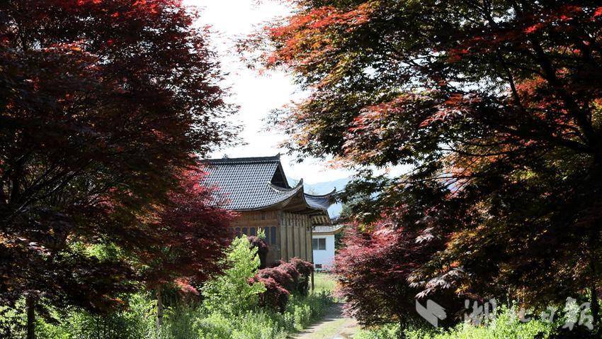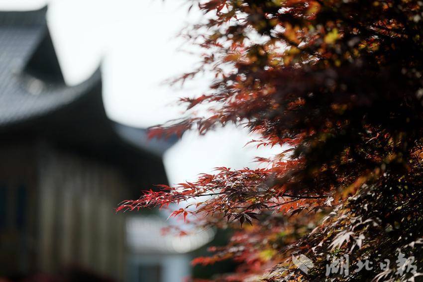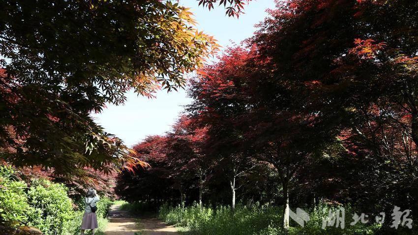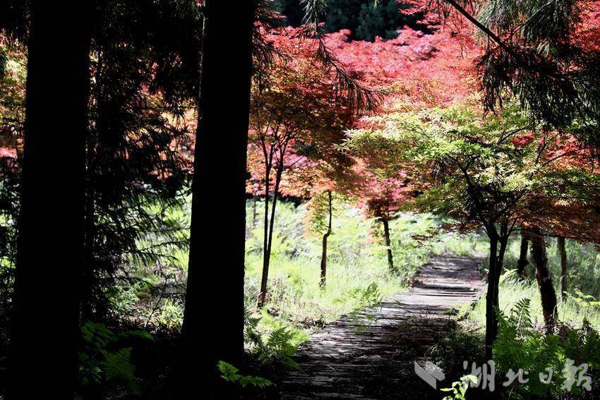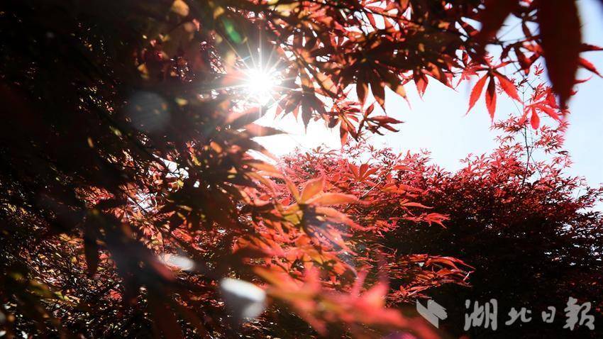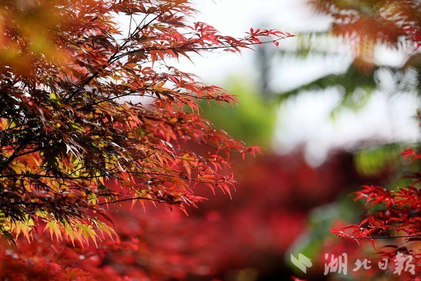 近日,位于鹤峰县下坪乡石堡村的九莲山上百亩红枫红了,不少游客前来打卡拍照。红透的枫叶一丛丛、一簇簇,远远望去,艳如鲜花,层林尽染。