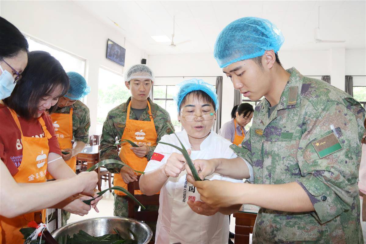 “折粽叶、放糯米、填馅料、捆粽绳,兵哥哥包的粽子又快又好!”在军营食堂里,你包粽子、我做糕点,在军民齐心协力下,军营内粽叶飘香,绿豆香气扑鼻而来。