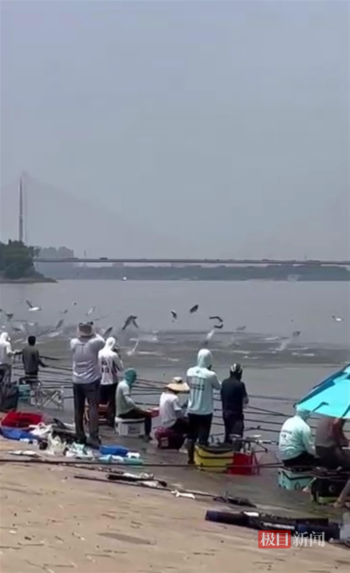 6月14日,一段题为“武汉市杨泗港大桥下鱼炸窝了”的短视频在网络上迅速走红。从网络上多段不同来源的视频可以看到,岸边有不少人正在垂钓,而距离岸边不远处有大量白鲢纷纷跳出水面,高度约为1至2米,就像是江水在沸腾,这一奇特景象引来拍摄者和众多钓友的阵阵惊呼。广大网友热烈讨论,纷纷猜测白鲢跃江的原因。6月15日,为了验证此段视频的真伪,极目新闻记者到现场进行探访,并采访了中科院水生所的专家对此现象进行了解读。