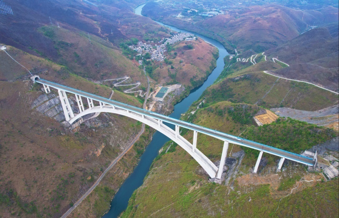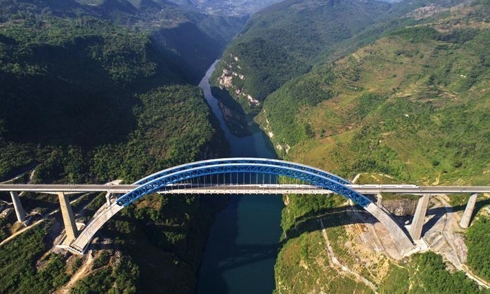 沪昆高铁北盘江特大桥,位于贵州省关岭布依族苗族自治县与晴隆县交界处,为上承式劲性骨架钢筋混凝土拱桥,大桥以一跨形式跨北盘江而过。大桥全长721米,其中主桥跨度445米,桥面距离北盘江江面约300米。