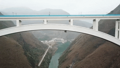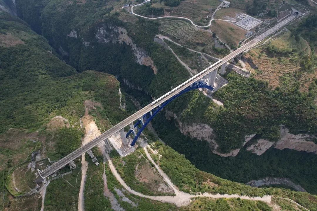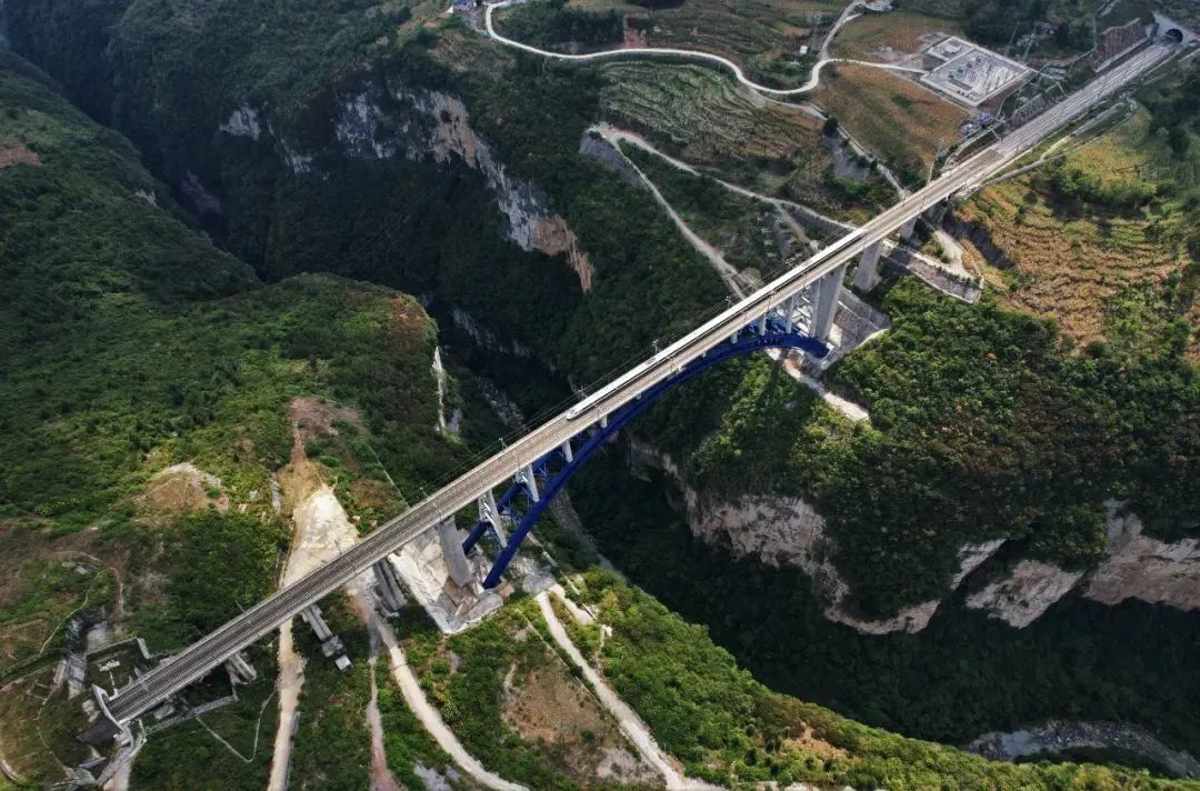成贵高铁鸭池河特大桥,位于贵州省黔西县索风营水电站上游约8公里处,是世界最大跨径高速铁路中承式空腹钢混结合提篮拱桥。大桥全长971米,主桥跨度为436米,桥面与江面高差275米。