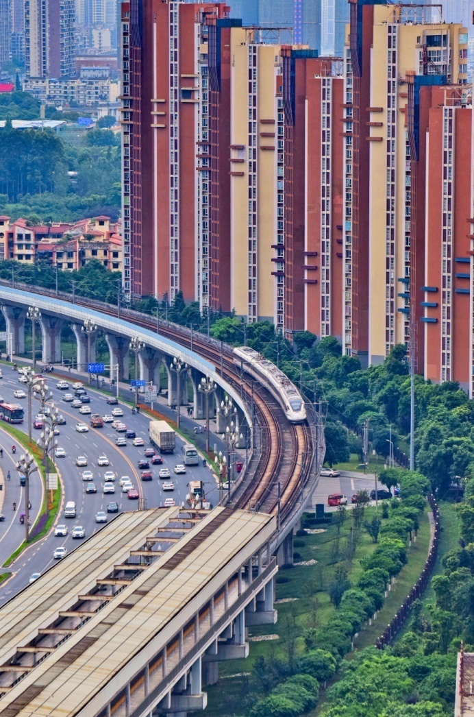 动车组穿过“城市森林”,行驶在成灌铁路的铁路桥上。茅磊 摄