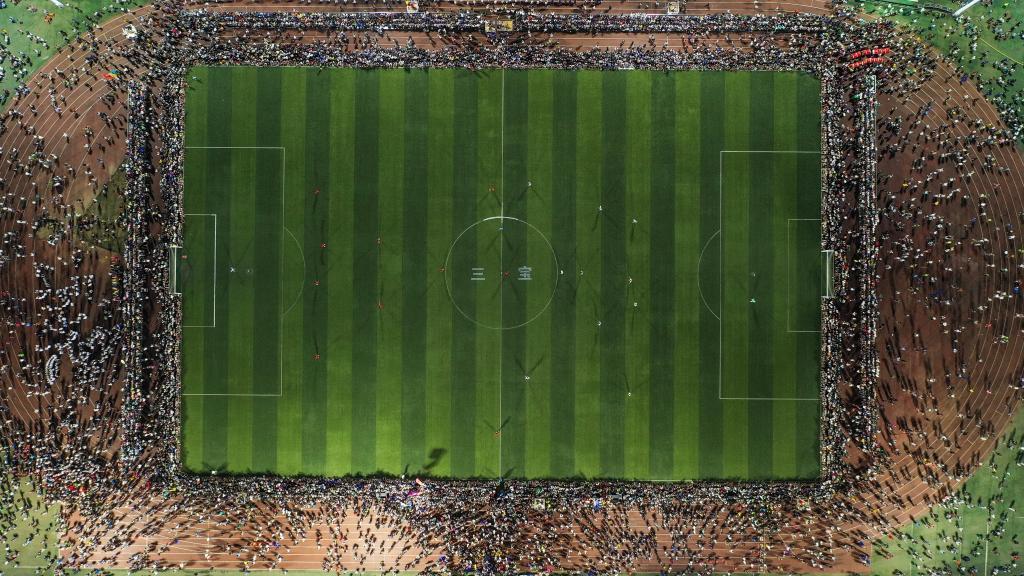 6月10日拍摄的贵州“村超”足球比赛现场(无人机照片)。新华社记者 杨文斌 摄