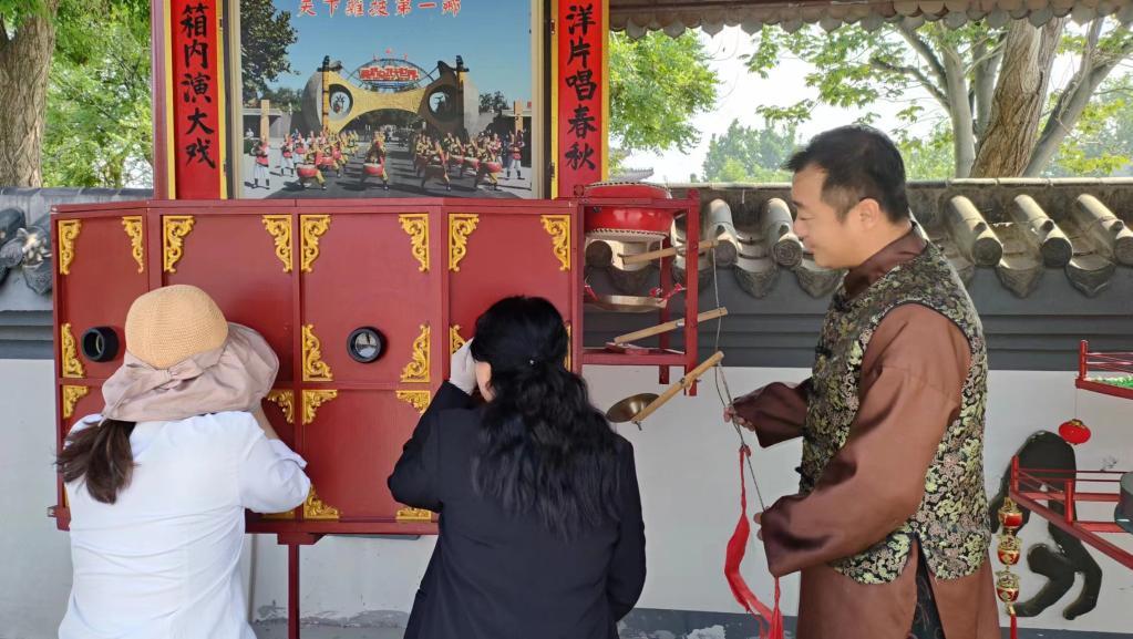 非遗传承人温俊来在为观众表演拉洋片。新华社记者冯维健 摄