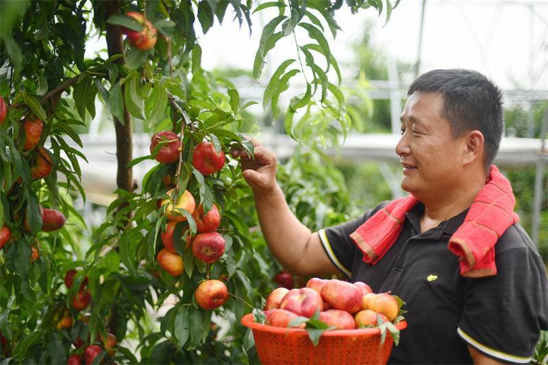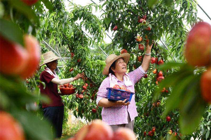 湖北日报客户端讯(通讯员 刘建平)2023年6月15日,湖北省咸宁市通城县北港龙门村聚丰祥和果蔬种植合作社,社员正忙着采摘蟠桃、分拣包装,一派繁忙的丰收景象。