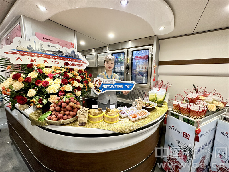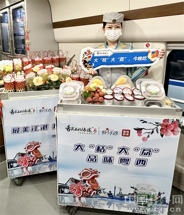 恰逢周五,C6972次列车人潮涌动,珠三角通过高铁的串联,活力十足。走进餐车,吧台摆放着鲜花、醒狮、泥塑等装饰品,亦展示着针对线路沿途地区美食新推出的:湛江沙姜烤鸡肉饭、双椒牛柳拼虾饭、中山乳鸽、新鲜荔枝等特色餐食与水果,浓浓的地区风土美食文化气息在餐车蔓延。餐车将该线路途径区域的系列美食与应季水果搬上列车,让广大旅客都可以领略到正宗的粤西风味。