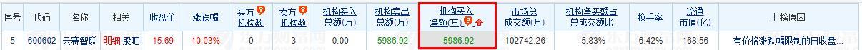 龙虎榜数据显示,云赛智联卖出金额最大的前五名中,有3家机构专用席位。经统计,云赛智联的机构席位今日净卖出金额为5986.92万元。