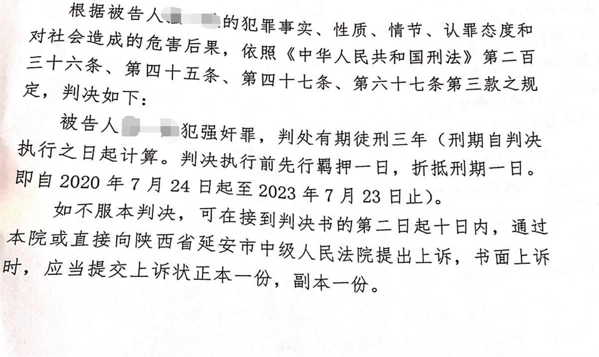 2021年1月4日,延安市宝塔区人民法院对此案进行开庭审理,并当庭判决李某行为构成强奸罪,判处李某有期徒刑四年。李某不服判决并提起上诉。2021年9月29日,延安市中级人民法院对此案作出终审裁定,法院认为,李某涉嫌强奸罪一案部分事实不清,裁定撤销一审法院的判决,发回重审。