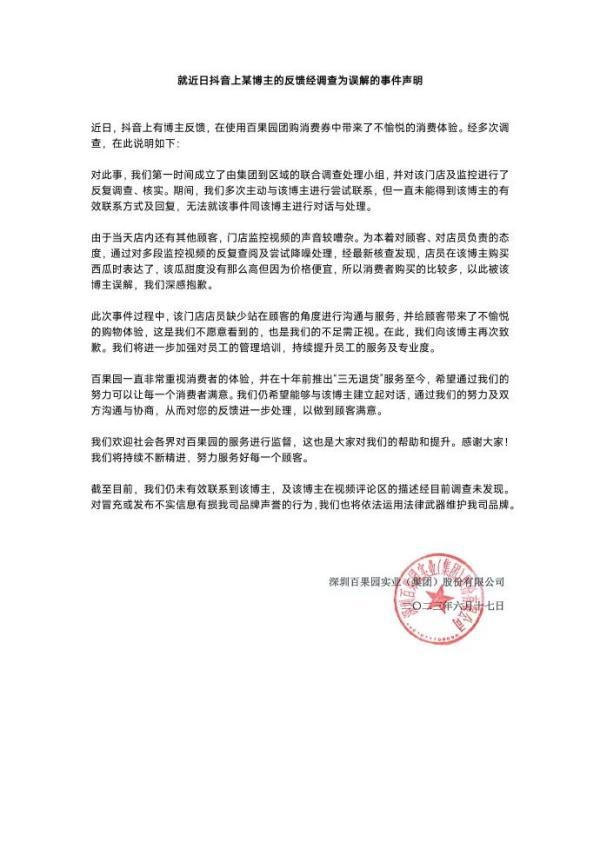 随后,百果园发布声明称,经最新核查发现,店员在该博主购买西瓜时表达了,该瓜甜度没有那么高但因为价格便宜,所以消费者购买的比较多,以此被该博主误解。