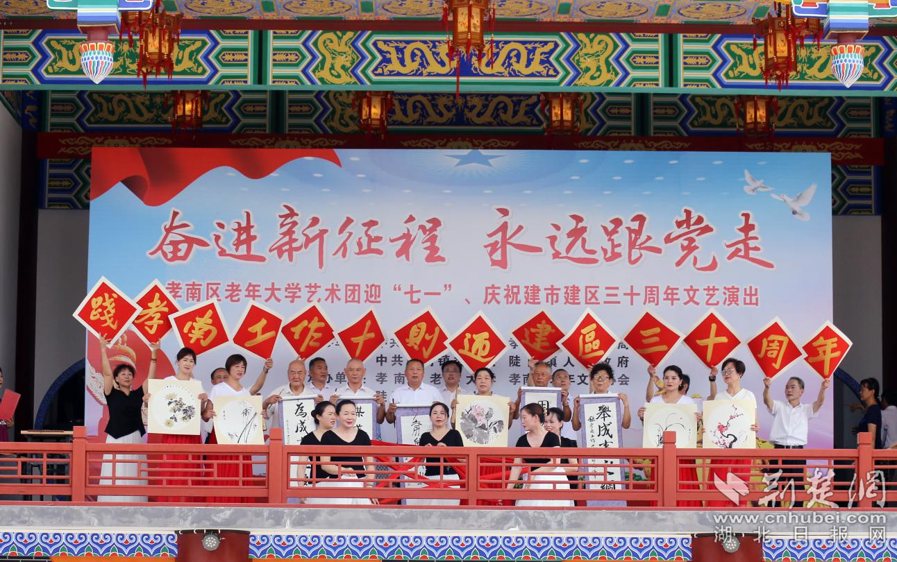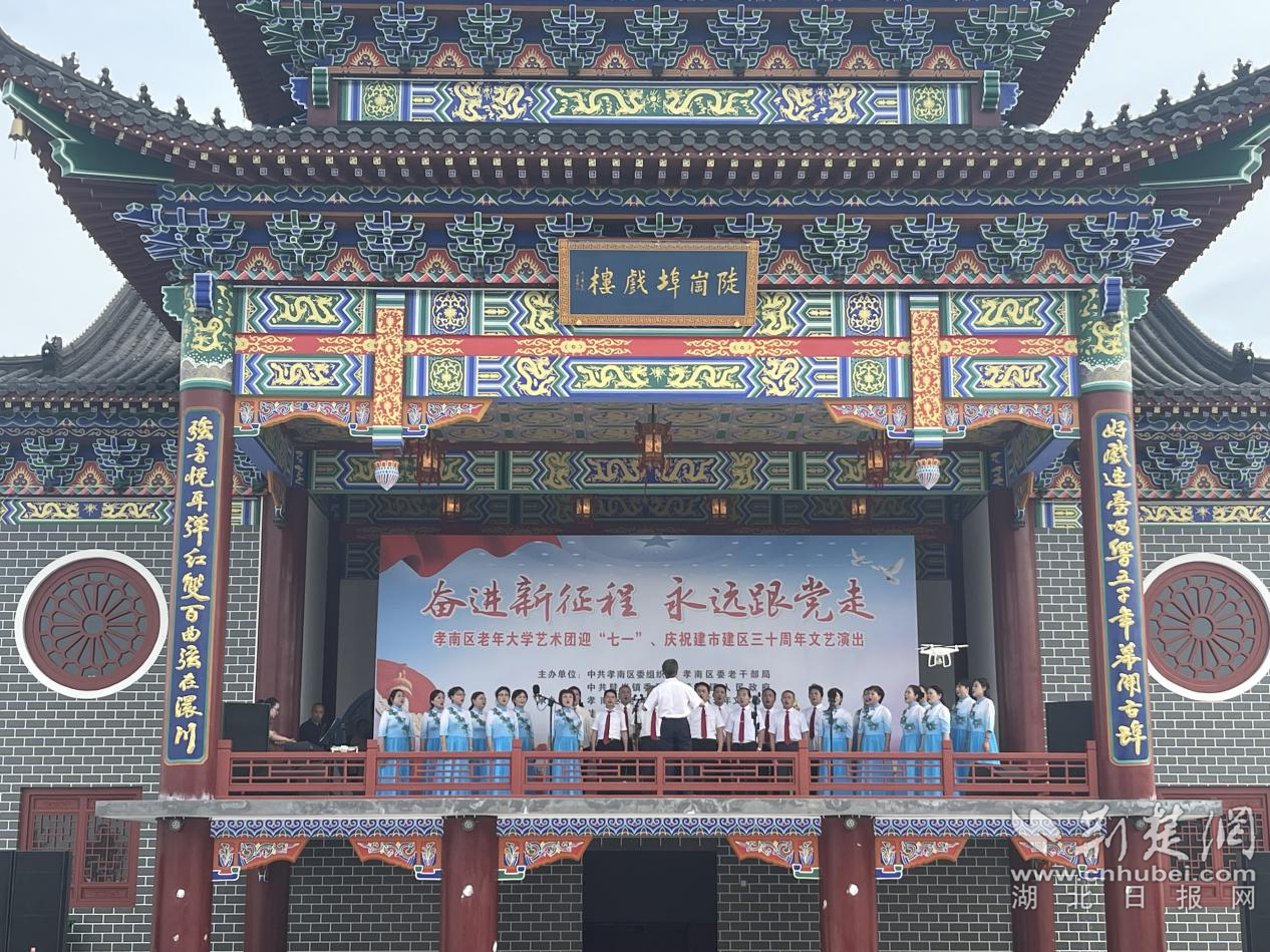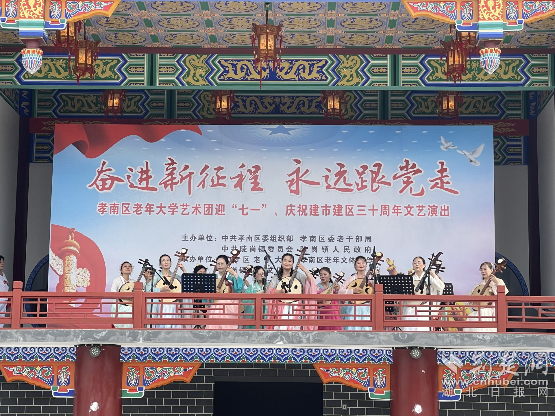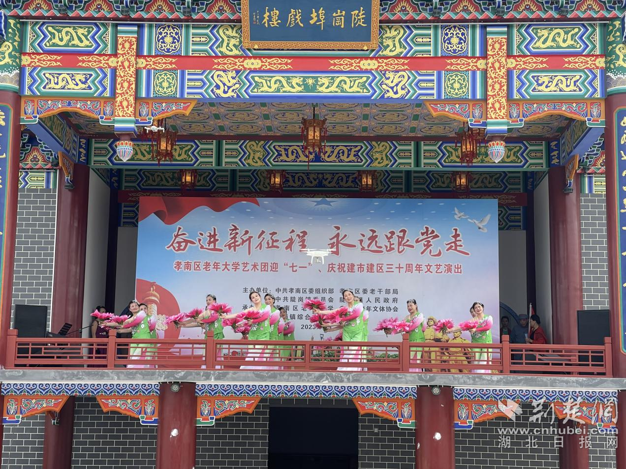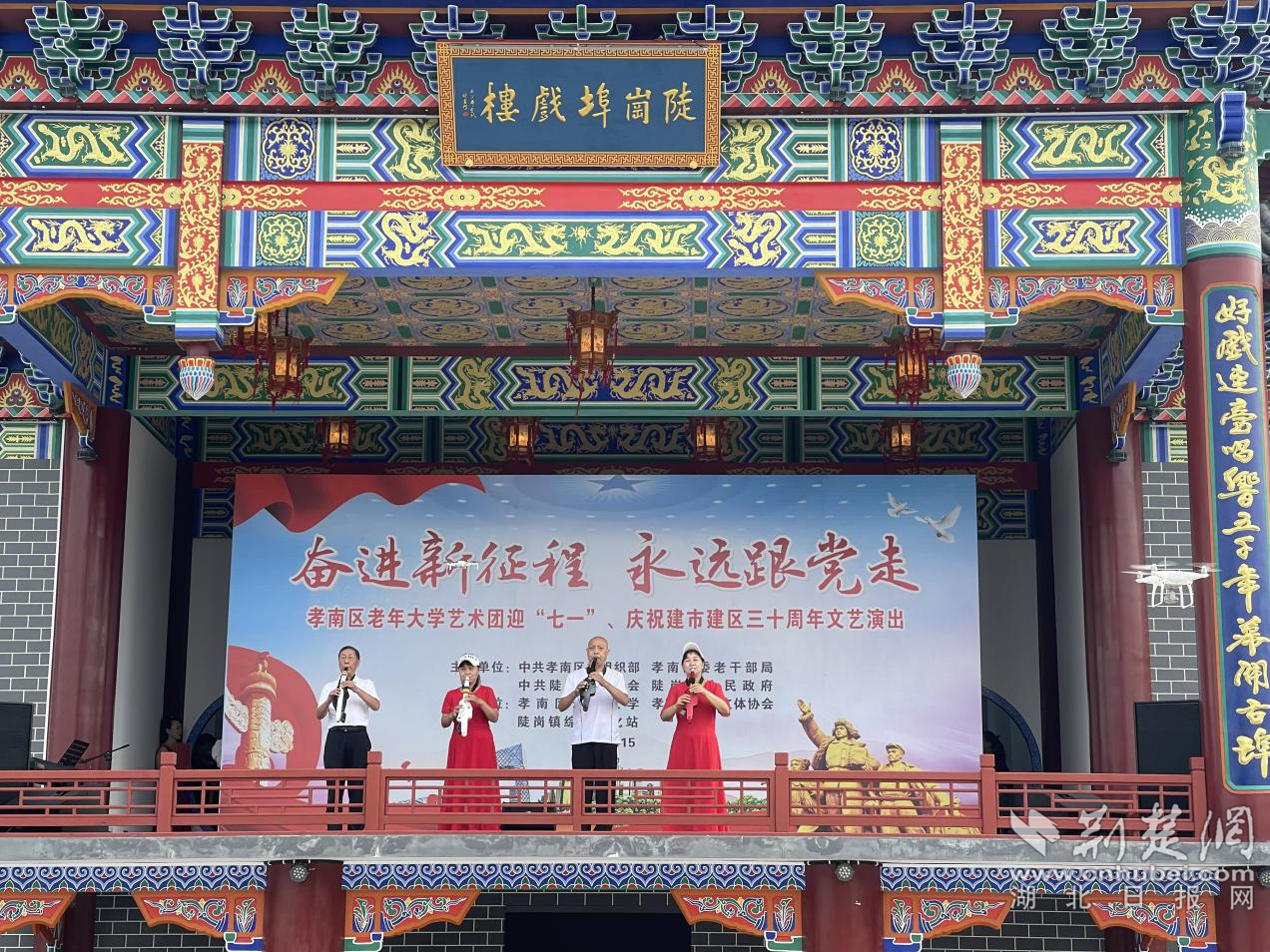 荆楚网(湖北日报网)讯(通讯员胡瑞)6月15日,为了庆祝建党102周年和孝感建市孝南建区30周年,由湖北省孝感市孝南区委组织部、区委老干部局、陡岗镇委镇政府主办,区老年大学、区老年文体协会、陡岗镇综合文化站承办的“奋进新征程 永远跟党走”文艺节目在陡岗埠戏楼演出。