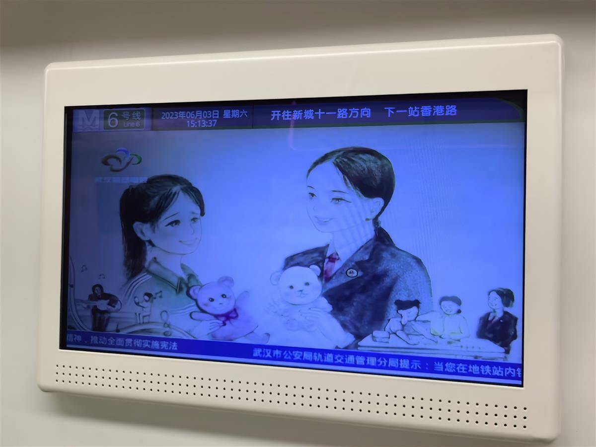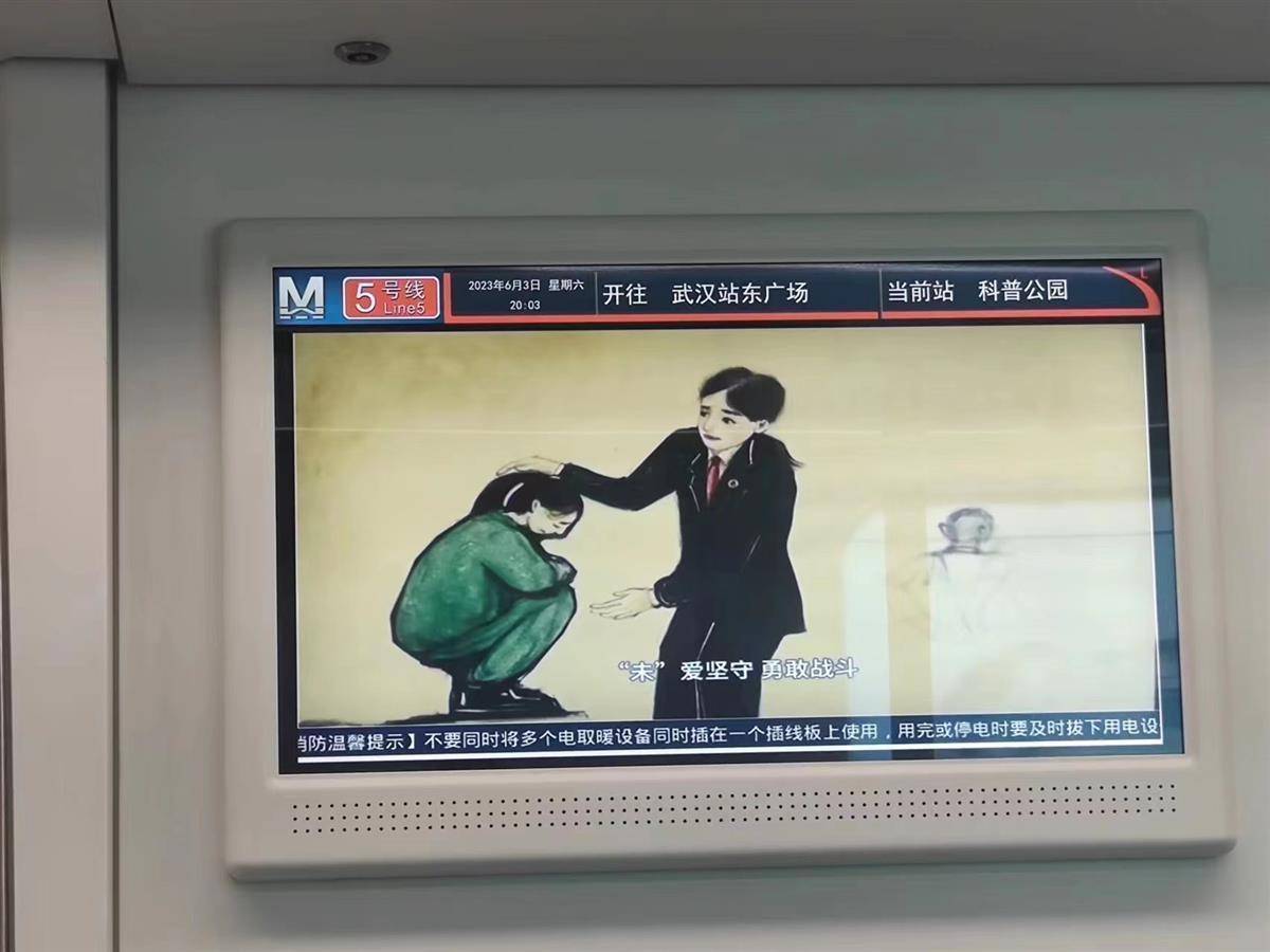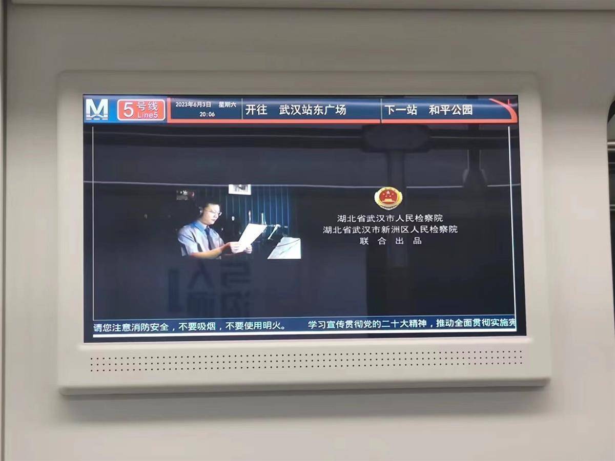 2023年6月,在武汉团市委、武汉广电、武汉地铁集团的协助下,武汉市检察院通过法治教育进地铁、上电视的形式,让社会大众在乘坐地铁期间接受沉浸式法治教育,让更多人了解未成年人检察工作,形成社会共同关注、参与未成年人保护的良好氛围。6月2日起,武汉地铁交通2至8号线以直播信号展播来自武汉市区两级检察院的16部未成年人保护系列法治宣传等公益视频。系列作品将在每条线路每小时播出一次,全天循环播出16次,所有视频轮换展播至6月30日。
