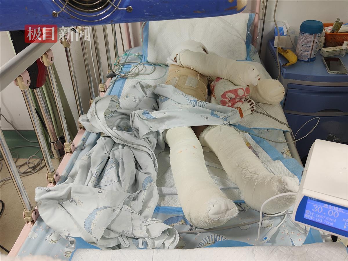 6月16日,极目新闻记者在武汉市第三医院烧伤科的病房里见到胡小军的两个女儿,她们一个8岁,一个3岁。记者到病房的时候,她们刚刚入睡,浑身包满了纱布。